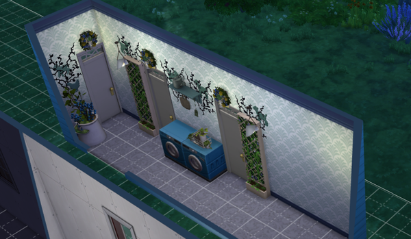 The bedroom hallway is very nice 🙂It is great that there is a laundry area there, and very nice blue colour. The outdoors areas are great! The greenhouse is lovely for growing plants indoors or doing flower arrangements and nice red color inside to complement with the red colour of the home building. The wraparound porch with areas to enjoy cooking, dining and playing music outdoors is very nice.
