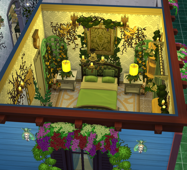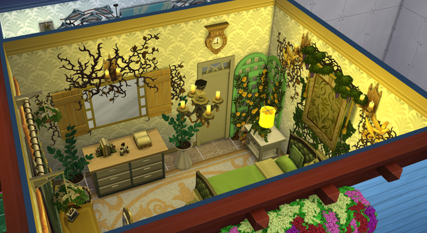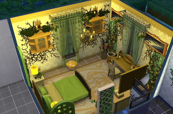 The bedroom is lovely! 🙂The yellow and green colours are nice and warm, and elegant wall pattern. The floral trellises are pretty in the corners. The furnishing is lovely and very nice calming candles.