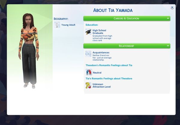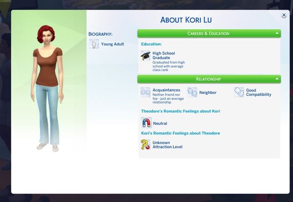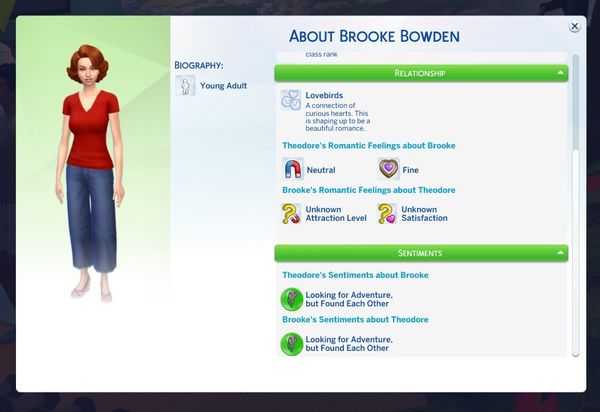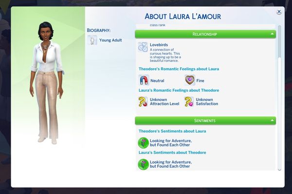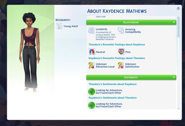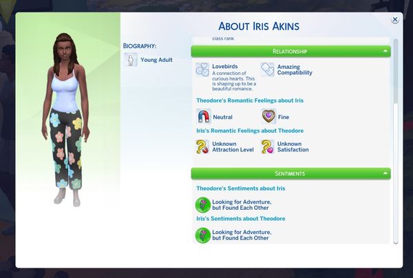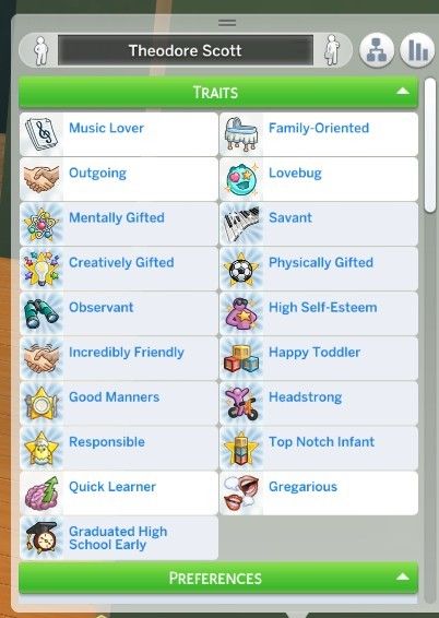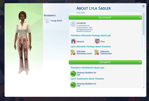 These are Theodore's traits. He just got the Lovebug one since being at the getaway for half a day. I think he is a good catch.