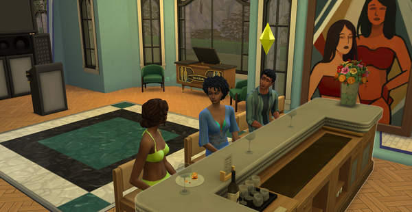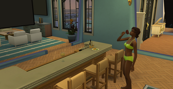 And I think setting less activities for the time slots would be better. I probably had too many choices, so the girls were divided between activities. I did read that you could change activities while on the getaway and I never tried it, but that might work out well. You could do hot tub one evening and dancing another evening. And you saw, I chose to have a bartender for the evening activities and a chef for mealtimes. It might not have been necessary. If your sim is a good cook, it might be fun to have a few people cook together or have more grilled meals.