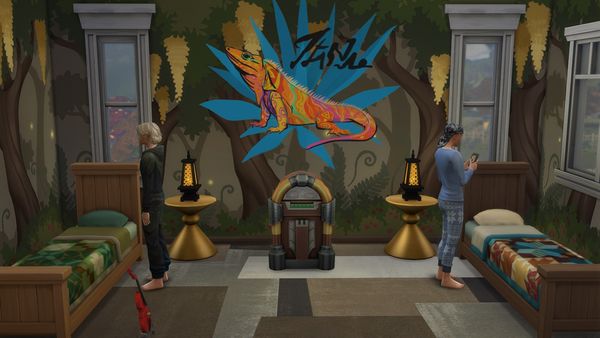 Straight ahead as you walk in, you see the ends of the beds: Jamison in blue is standing by his bed.