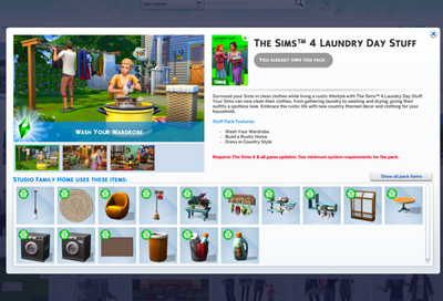Studio Family Home (includes several items from Laundry Day that you could replace... a picture window,I think from the dining room and maybe room below, a round table and laundry room items, but otherwise you own the packs)