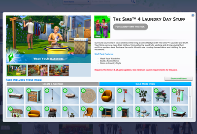 ...and it will open a list of the items from that pack that are used in that build (example below - items used from the Laundry Day pack in that 'Studio Family Home' I mentioned above)...