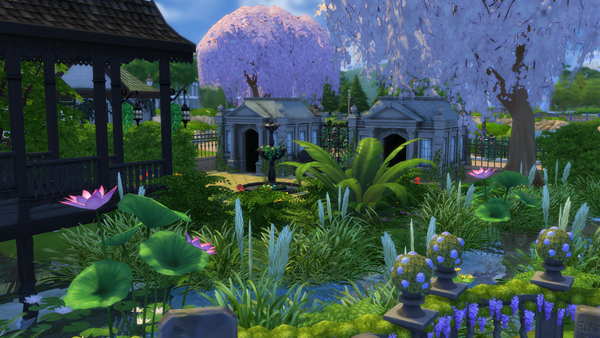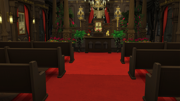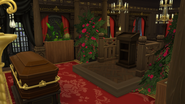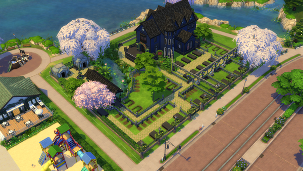 Built on Twin Oracle Point in Newcrest, this is a beautiful lot for funerals and laying your Sims to rest. A small stream separates a set of crypts from the rest of the graveyard, and the old Victorian building is beautiful both for funeral ceremonies and small weddings, if your Macabre Sims fancy eloping at the graveyard! The second floor is functional as a reception area, with a dance floor, bar, and buffet table!