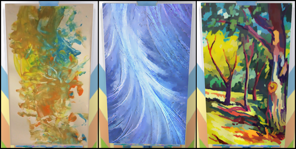 Hace mucho que no comparto cuadros de mi sim pintora así que vengo a traer otros 4 como de costumbre 😄. Son abstractos pequeños como los anteriores, luego siguió pintando pero se repetían y creo que estos son los que aún no había pintado nunca.