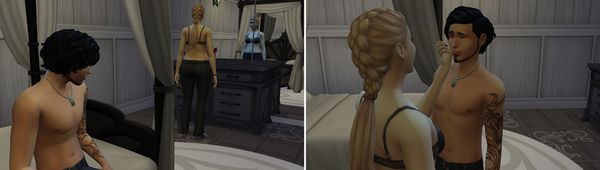 Eivor : "J’ai appelé Aby, elle va faire en sorte qu’ils n'apparaissent pas sur la table si les garçons viennent à manger à la maison, comme elle fait pour Narcisse. Ca évitera les questions ou remarques. On s’est mis d'accord, pour Armand et Dorian, tes enfants sont végétariens, enfin ceux d’Ursula… on a passé sous silence le fait que tu sois leur père. Abigail devait briefer Roland et Deirdre."