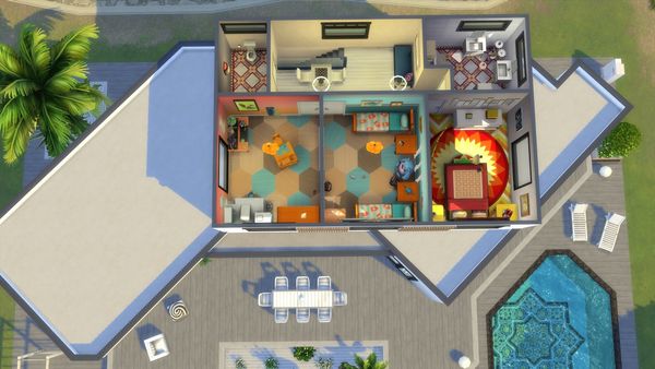 Au rez-de chaussée, on trouve une buanderie, une pièce à vivre comportant la cuisine, la salle à manger et le salon (tout est ouvert), ainsi que des toilettes indépendants (avec lave-mains) et une chambre parentale avec salle de bain, bureau (dans la chambre) et dressing. La chambre à sa propre baie vitrée donnant sur la terrasse.