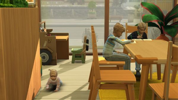 Pour leur anniversaire, j’avais sorti de la cave mon ancienne table d’activité, et Oliver et moi en avions fabriqué une deuxième avec l’aide de cartons. Les jumeaux passaient beaucoup de temps à dessiner et laissaient s’exprimer joyeusement leur créativité.
