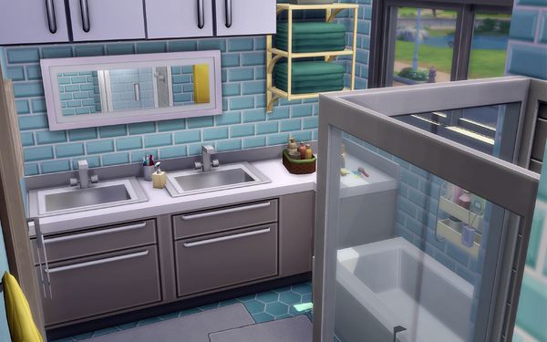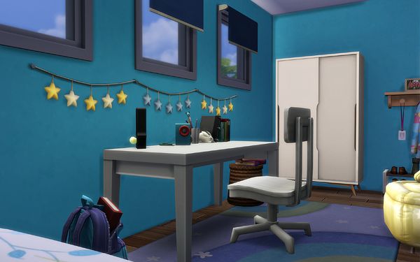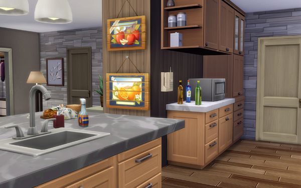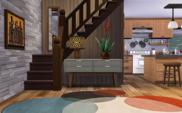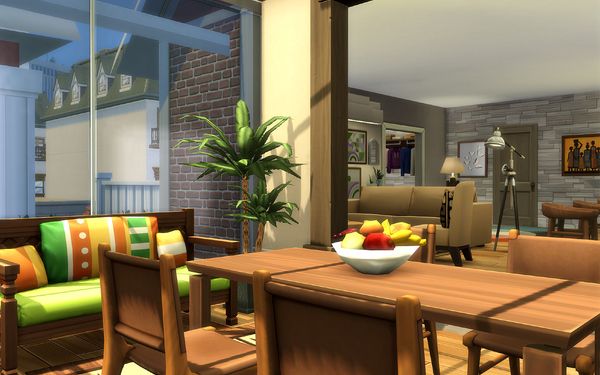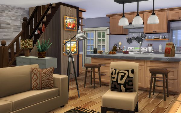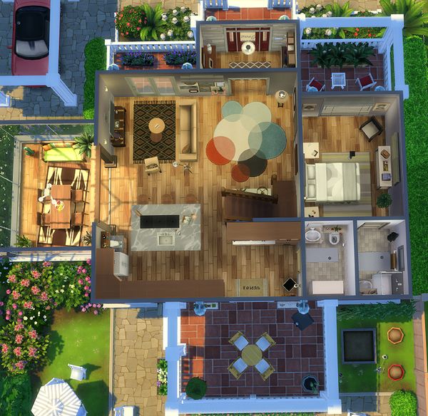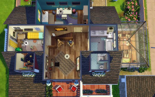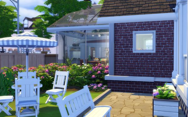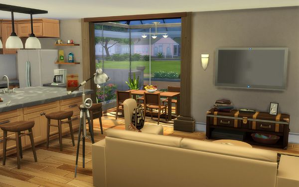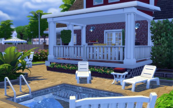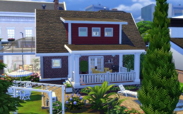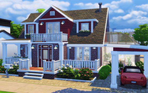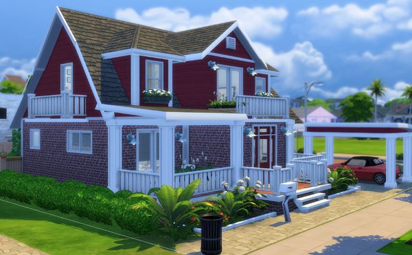 BaseGame, mais pour un budget conséquent tout de même : 84 090 § pour cette maison installée sur un lot de 30x20. Elle offre une pièce de vie avec cuisine ouverte plus véranda au rez-de-chaussée ainsi qu'une chambre parentale, deux chambres d'enfants à l'étage ainsi qu'une salle de bains. Terrasse et piscine dans le jardin.