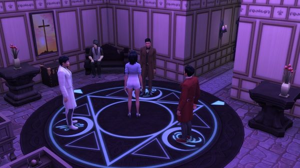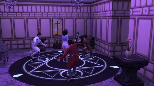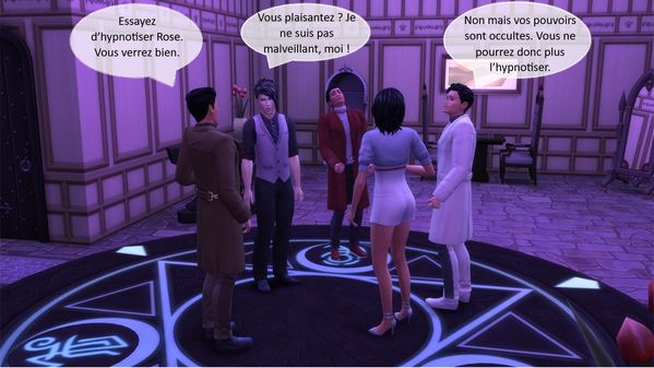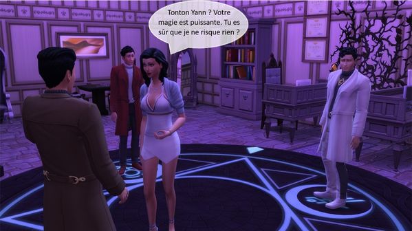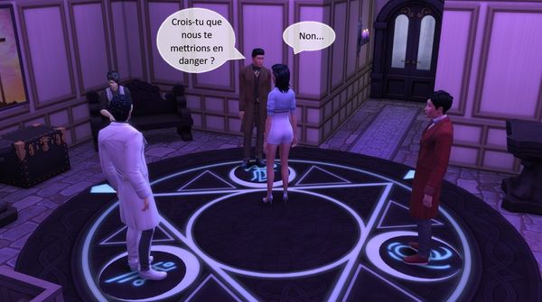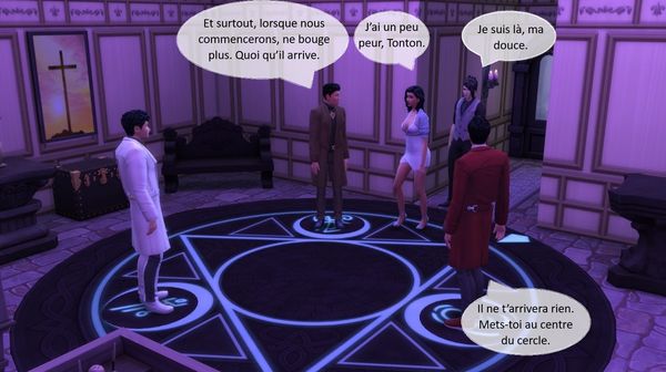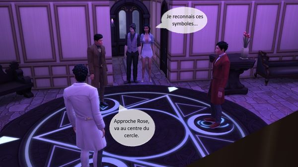 Lorsque nous arrivâmes au sous-sol, l’atmosphère avait changé. Les protecteurs avaient installé une dalle de pierre noire circulaire et la luminosité de la pièce avait changé. Ils avaient tous trois pris place sur un des symboles lumineux qui se détachaient du cercle. Rose murmura quelques mots que j’entendis car j’étais près d’elle mais Yann l’appela.