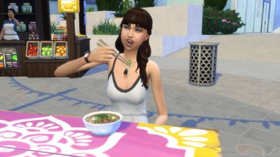 Le week-end, je profite pour me balader à San Myshuno avec la famille ou les amis et parfois toute seule. Je mange mon premier plat avec des baguettes et ce n'est pas facile. Je galère bien. Va falloir que je m’entraine.