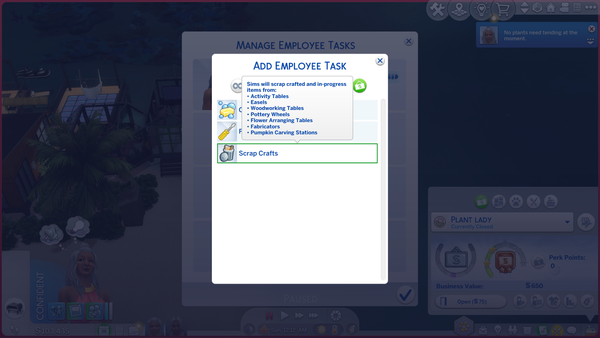 If you're still here.... samesies on the Scrap Crafts option. its available as an employee task for a small business. I would LOVE to be able to assign that task in a getaway. The sims make crafts and then they sit until I make one of my sims scrap them (or I do it in build mode). Again.... no fun.