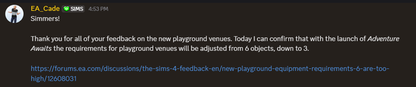 Thank you for all of your feedback on the new playground venues. Today I can confirm that on October 2nd with the launch of Adventure Awaits the requirements for playground venues will be adjusted from 6 objects, down to 3.