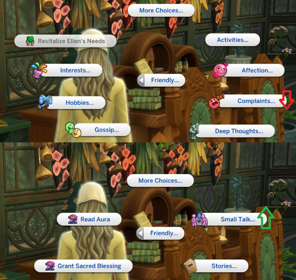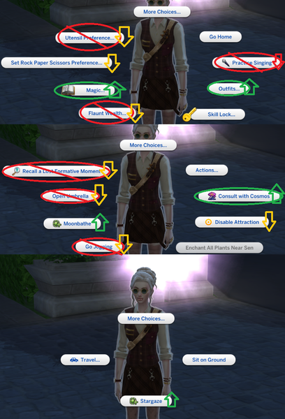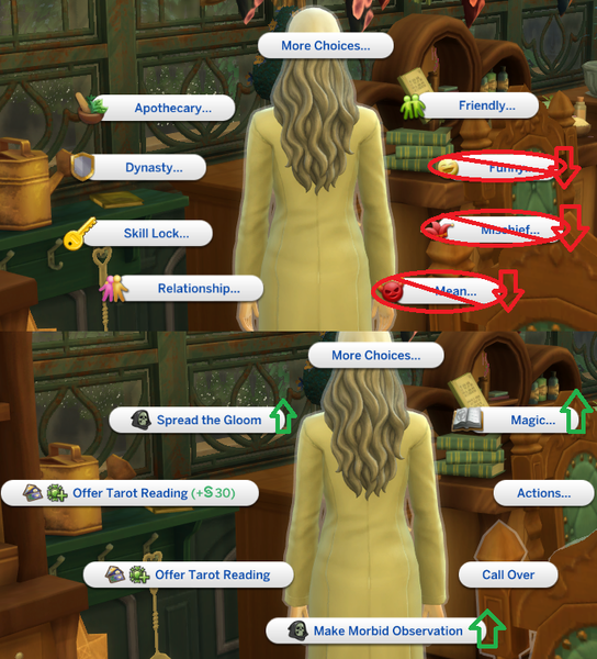 This example my Sim both dislikes and Ideals are against mean/mischief so should be demoted or removed. Magic should be in the first level/tier.