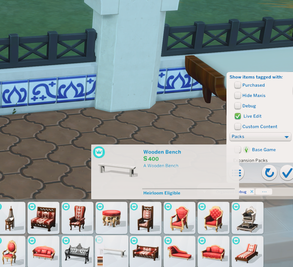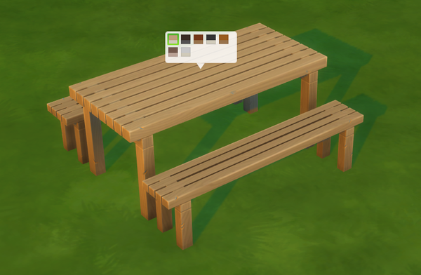 • I noticed the same issue with the Wooden Picnic Table as well. Only available with the live edit objects cheat. It also has a rather simplistic name and description just like with the Wooden Bench and both cannot be eyedropped either.