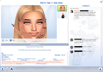 One commented that CC was used and they are in the description if anyone’s confused. I made a reply to that which can be seen in the screenshot. (Shoutout to the people who misuse the hashtag #mccc_include by posting it in the comments.) Sure, this upload is honest about using mods, but if you notice, there is no CC-tag on the upper-left corner in the thumbnail, indicating that the uploaded Sim is modded. This allows them to appear in the regular page of the Gallery, specifically sorting the uploads to Popular Now and filtering only Households, without the need to tick the “Include Custom Content” checkbox, and effectively burying genuine vanilla/unmodded Sims—almost like SIMS4DENISE’s upload in the first image above.