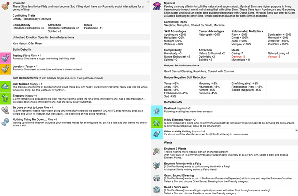 Also, add the Sim Characteristic Mysterious, as with occult Sims and traits like Macabre/Mystical are Mysterious Ideals, also if Medium skill and Tarot could be likes/dislikes, and Thanatology skill (they could be Mysterious). For both likes/dislikes and turn ons/offs.