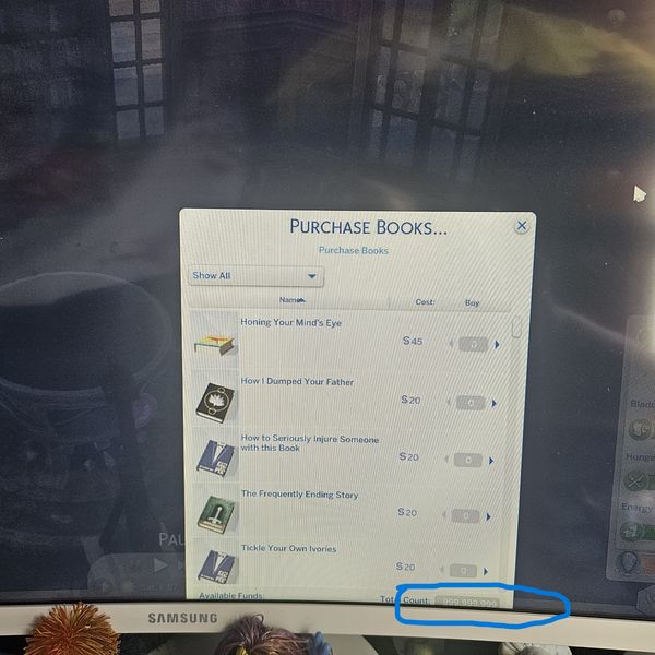 When I try to buy them, it opens up a menu so that I can select what I want, and I can select the books I want (in this case I'm trying to buy high school homework books because they have disappeared from my teens inventory), but there is no option to make the purchase. I think I can explain it better in a screen shot. The menu for purchasing books pops up too low on my screen. And, if you look at what I circled, it shows the total cost as 999,999,999 Simoleans. And, even if I had that much money, I wouldn't be able to purchase because I can't get to the purchase button. I've tried to drag the "purchase books" window up so that I could get to the button, but the window won't drag. Other times the interaction to buy books gets canceled altogether. But I will try what you mentioned above.