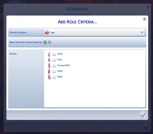 While editing the schedule/roles of a Custom Venue (built from scratch), I am not able to set criteria for roles. I choose a category (age, occupation, etc.) but the check list that should follow for each category does not show up. The area just stays blank/white. It did help to close/restart the game, but it only worked for 1 edit/1 role.