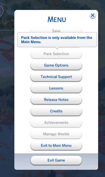 After a while, the same freeze happened. I was able to go to Build/Buy and put down some terrain paint, but there was no option to erase it or undo it. I went back to live mode - still frozen. Went to Manage Worlds. This time it didn't get stuck, but this is how my menu looked: