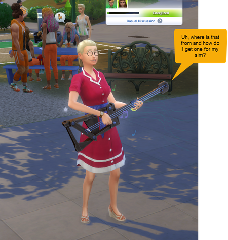 So, I was playing last night and my sims had a club meeting at the park in Del Sol Valley and this random sim showed up and started playing this guitar Where is this from and how can I get thi...
