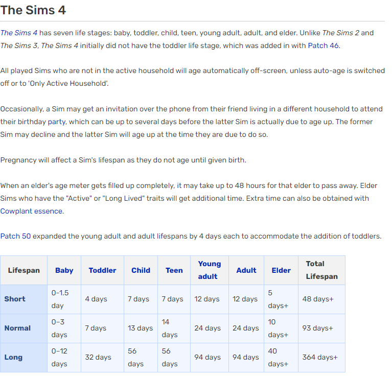 Update to the Lifespans in the Sims 4. The Sims 3 lifespan setting were much better than the Sims 4 current options. The option of having medium and epic was a game changer for many simmers who don...