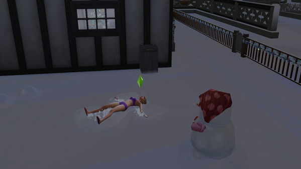 @jpkarlsen, yes that would be hilarious! 😃 I don't think you could actually go swimming in winter and not have the cold effect you since you automatically change into your swimsuit category from any other category. So even if you had a bikini as your cold weather outfit, you would change out of your cold weather outfit into your swim outfit, and therefore you would feel the effect of the cold even if your swim outfit was a heavy coat and wool cap.😉 But you can make a snow angel and build a snowman in a swimsuit or underwear that is set as your cold outfit. :eahigh_file: Here is a Sim of mine playing in the snow in her underwear that is set as her cold weather outfit: