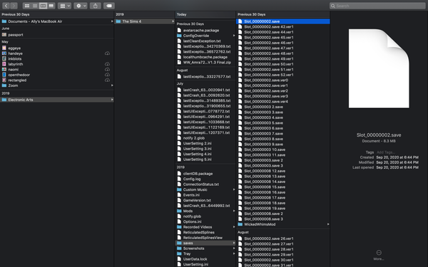 Thank you so much @puzzlezaddict! You're right, it was uploaded to the iCloud so I disabled iCloud's automatic syncing and moved the save back to the local Documents folder. The file path is now Macintosh HD ▸ Users ▸ allyang95 ▸ Documents ▸ Electronic Arts ▸ The Sims 4 ▸ saves