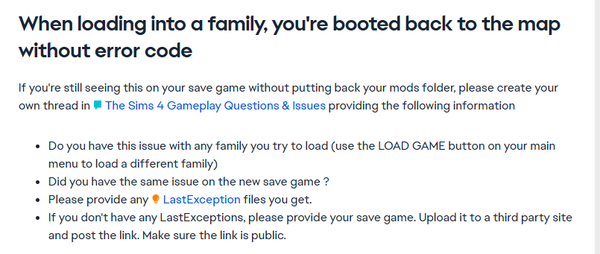 Hi, so I'm not seeing any errors or anything. Nothing pops up, it just kicks me back to the world selection. I did check out the thread but I am throughly confused and overwhelmed with all of the instruction about what to do. Nothing seems to specifically address what is going on with my game. I don't have errors or long loading screens/times. Just kicks me back to world when I try to play any household. This is true with our without mods/cc. Even without mods/cc, I don't get any sort of error message.
