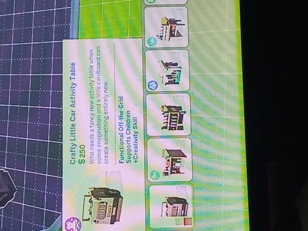 The activity table that comes with the backyard movie screen and smores items (it's a kit, dont remember the name of it), called the Crafty Little Car Activity Table, is missing the Fun need in the description, which every other activity table fills. I havent actually played around with the activity tables before, so I am not sure whether it *does* fill that need, but I assume that it is supposed to since all of the others do.