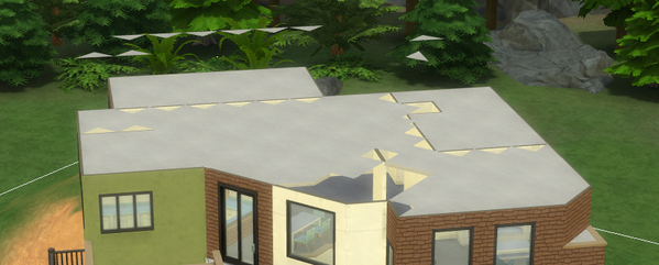 in build mode, when adding stairs from a platform, the stairs have a visual glitch that makes them partially invisible (this changes based on the angle of the camera) and my ceiling went crazy (as shown). The floating tiles are not considered to be on another level, and I can't click on them or anything.