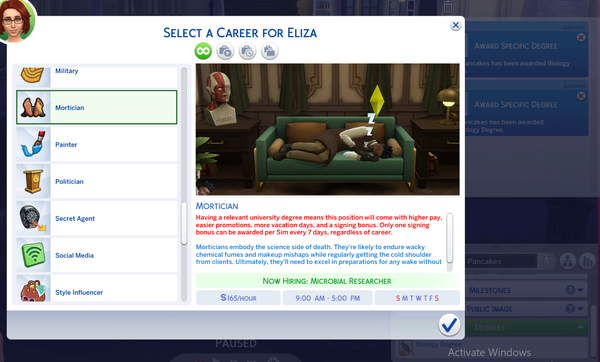 I just want to know how to solve the mystery that seems to be there. The chance cards keep popping up with no way to solve and you have to be a ghost for one of them, which my Sim is alive for that. Also where did you get the University degree related to the Undertaker career? I've looked through them and none of them give benefits for it.