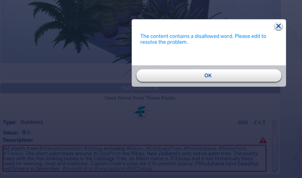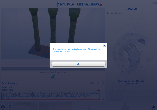 Anyone have any idea what the issue is with my gallery description? Wish the game would highlight the problem words ;(
