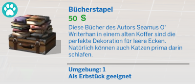 Der Bücherstapel aus H&K ist ja mit dem letzten Patch zum Bücherregal geworden. Dann hätte im Text eigentlich auch ein "Spaß: 5" ergänzt werden müssen, analog zu allen anderen Bücherregalen. Zumindest in der GER-Version fehlt das (das englische Original kann ich leider nicht abgleichen):