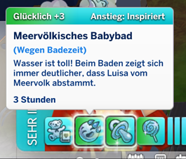 Meine Luisa Robles ist dank Meertang Meerjungfrau und ihr Mann Evan ist ein geborener Meermann. Sie haben ihr erstes Kind names Elektra, die gerade Säugling ist. Jetzt hat Luisa ihre Tochter das erste Mal gebadet und wie schon bei Evan, als er klein war, hat Luisa ein süßes Moodlet gekriegt (siehe Foto). Bei Evan war noch alles in Ordnung, aber das von Elektra bezog sich auf Luisa, nicht auf ihre Tochter Elektra.