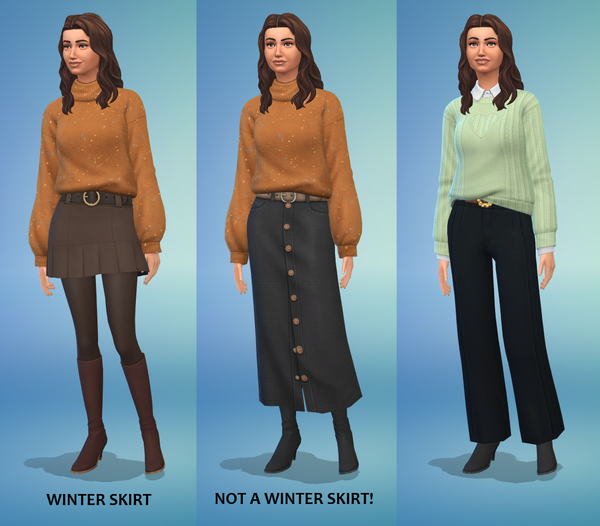 It's quite astonishing that the new short skirt is set for cold weather... there are only about 4 skirts in the entire game which have that tag, which is ridiculous really. Some nice, warm, long skirts like the second one are not tagged for Winter.