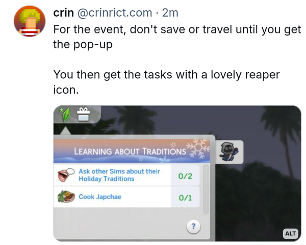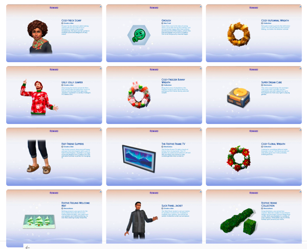 So.... it took all of 3 minutes to complete week 1's tasks lol. Ask other sims about traditions - my sim asked his son and his son asked my sim. Done. Cook Japchae - a level 1 recipe, so done in a jiffy. Stargaze - my sim and his wife lay on the ground and looked at the stars for a moment. All done, prizes claimed (one cozy festive wreath and festive hedge collection).