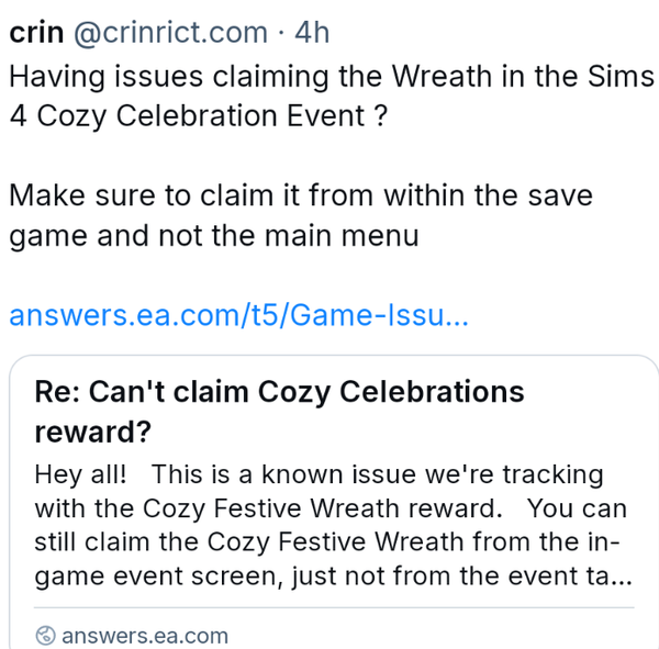 https://answers.ea.com/t5/Bug-Reports/Can-t-claim-Cozy-Celebrations-reward/m-p/14315309#M24148