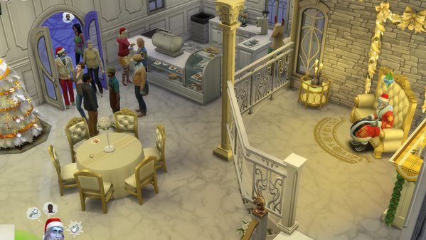Your Cake Bake shop is very lovely! 🙂Very nice design and great layout! The Christmas tree is pretty for customers to see whilst visiting the store and sitting eating there at the table. It is nice that you have used the round dining table and the gold colour scheme and marble flooring are elegant and festive. Very nice cafe counter and glass display cabinet area. The raised Santa meeting nook is very lovely🎅The fireplace is nice and warming.
