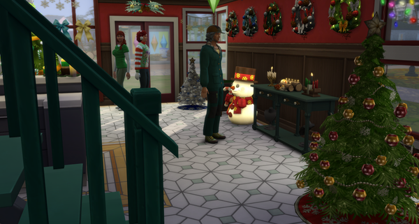 Your holidays shop is lovely! 🙂The furnishing with festive items to buy is pretty! The wreaths are lovely on the walls, and the colourful bows on the windows are very nice. The glowing candles are pretty ❤️