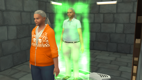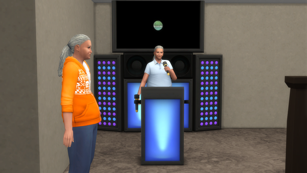 The clone’s eyes widened. “This. This is what I heard.” Vaughn Prime blinked. “You heard the karaoke machine.” “It was calling,” the clone said, completely serious. Alien ears are acute even in human form. Before Vaughn could protest, the clone strode over, tapped the screen, and selected Pop. The machine chimed, lights flickering to life like it was thrilled to be included in the plot again. The clone inhaled — and when the music started, he didn’t hesitate. His voice was clear, startlingly precise, perfectly on pitch. Not trained — innate. Like the machine had printed the talent directly into his bones. Vaughn Prime stood there, arms akimbo, watching his duplicate belt out a pop song in the basement like it was the most natural thing in the world. When the final note faded, the clone turned, breathless and glowing. Vaughn Prime stared. “You… are very loud.” The clone grinned. “I’m alive.” And for the first time since stepping out of the crypt, Vaughn Prime smiled back. “Then sing,” he said softly. “It’s Simsmas.” And somewhere beyond them, muffled by stone and snow, the world shifted — just a little — to make room for both of them.