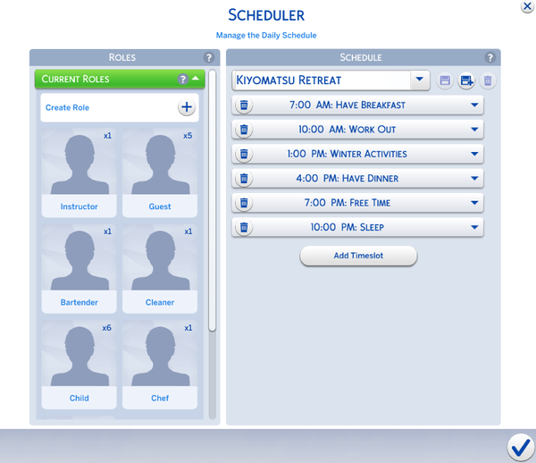 I wish we had smaller time gaps, so that a person could throw in the toilet and shower time as well, if only we had two hour time slots instead of three 😊 We could also have a lunch or dinner time too. But all in all I am happy with my set up :) Just wish we had more control over outfits. If you use the option for everyday, sleepwear and so on then it goes to their personal outfits and not the ones I set, so its pretty frustrating that part.