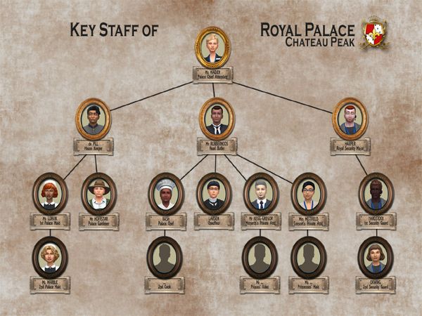 (Full size version here) Those without a portrait are not currently occupied. In addition Nanny and Governess is not included because there are no younger members of the royal family residing at the palace. Aaand, there are of course additional staff, I just had to scale everything down to the game format. Map shows only 3 housemaids (incl. Housekeeper), while there are probably 30... More about the palace Staff on my blog.