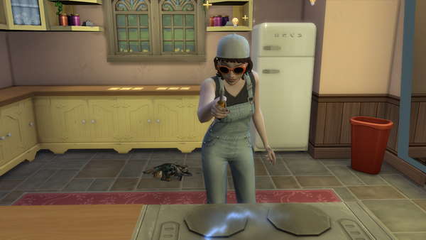Took a quick shot of my Werewolf, Munchybug - junkyard wolf and expert mechanic - repairing the stove after a crazy night of her and all of her housemates rampaging and wrecking the house, lol. I didn't look at this pic until after I'd closed my game and I really like the character of it. 😆
