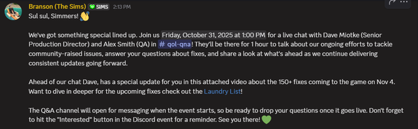 If you encounter an issue, please continue to report and vote on The Sims 4 Bug Reports page. Thank you for your time, as this information is critical for us to prioritize and verify fixes. Keep an eye out on The SimsDirect across X and Discord for future updates!