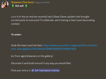 simgirl1010Hero1 year agoHeart Pool Decorating Contest (Winners Selected) Official Rules: https://discord.com/channels/1151759657283629076/1267520493360123965 Heart pool lot: https://www.ea.com/en-ca/games/the-sims/the-sims-4/pc/gallery/F0D72813037B4BE5B6B...Show More