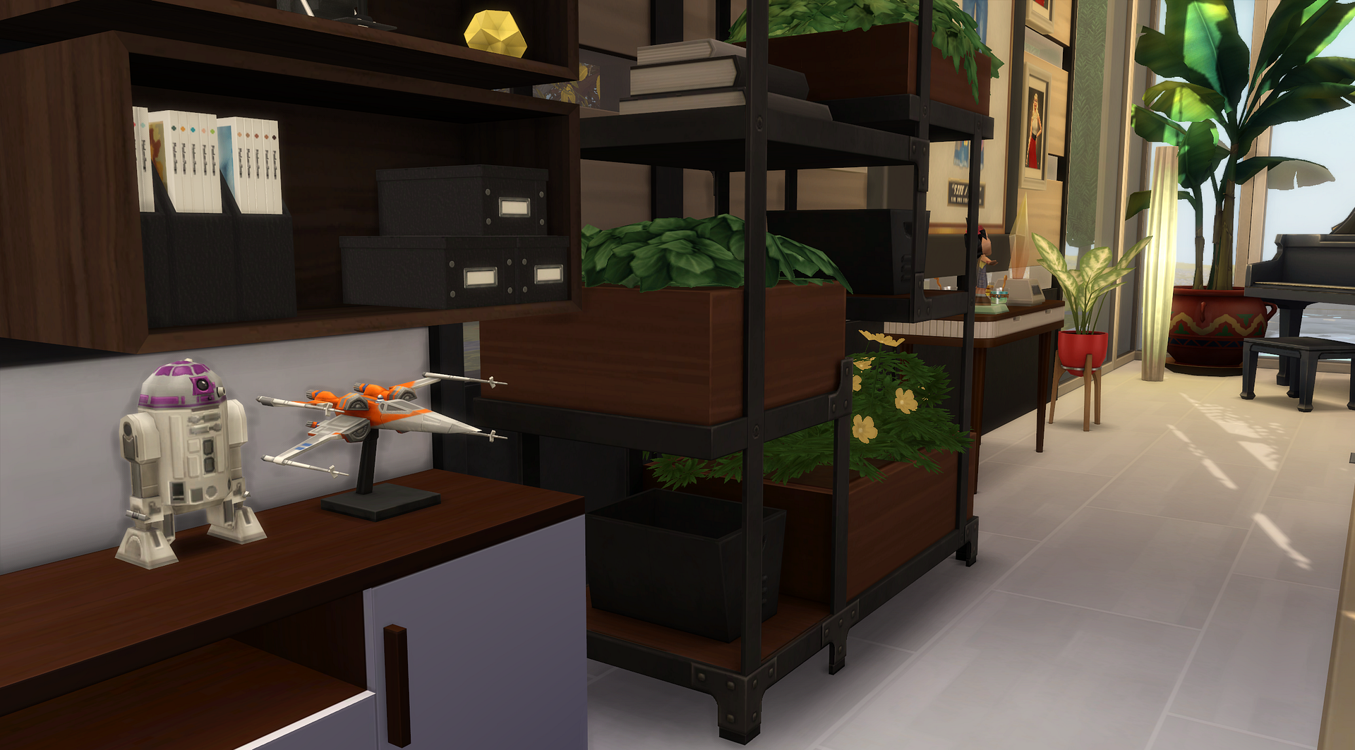 After playtesting it, I added a sabacc gaming table and a few astromechs hanging around. My favorite part is the little refueling station with the speeders and gonk droids. The only thing that doesn't work is the bathroom, but it looks nice where it is, and I don't mind it just being for show on a public lot. Even the Batuu eatery works! I might give it the Teen hotspot lot trait to give the little Padawans a place to hang out.