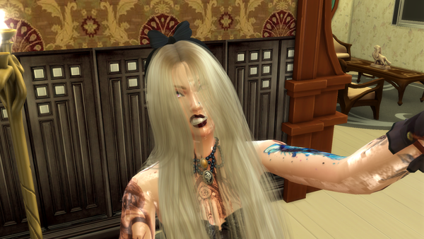 This is my character, Darkness (yes, that's her name). She is a .... type. MY type, lol........................ I clearly have some CC or mod issues here as she is all mottled right now. Guess I'm going to have to go and work out which piece of CC it is. I only have one mod at the moment, and I am certain that is not broken.