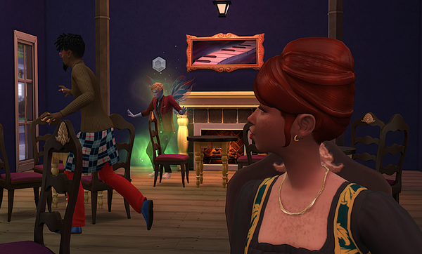 While Laura plays the piano for the townies, the fireplace flames dances with the melody.