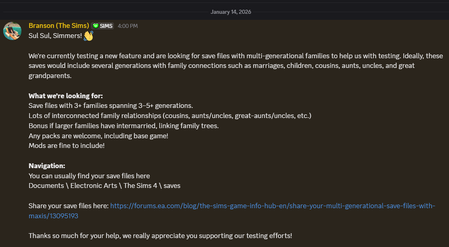 simgirl1010Hero1 day agoMulti-Generational Save Files Needed Share Your Multi-Generational Save Files with Maxis! | EA Forums - 13095193 https://discord.com/channels/1151759657283629076/1151759658013437952 Share Your Multi-Generational Save Files with Ma...Show More